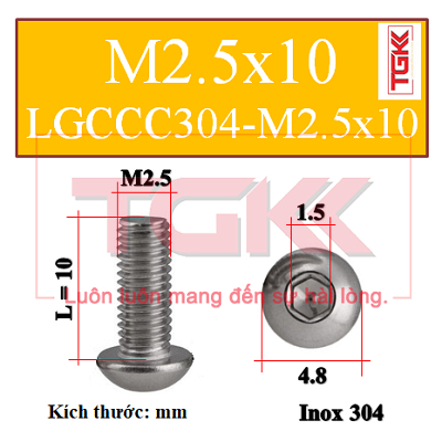 Bu lông lục giác chìm chỏm cầu inox 304-M2.5x10