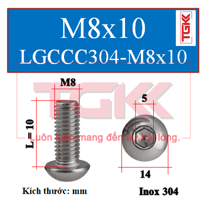 Bu lông lục giác chìm chỏm cầu inox 304-M8x10