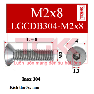 Bu lông lục giác chìm đầu bằng inox 304-M2x8