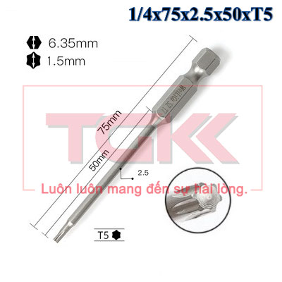 Đầu bắn vít hoa thị 1/4x75x2.5x50xT5