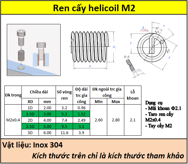 Ren cấy Helicoil M2x0.4x1d (2mm) sus304 |